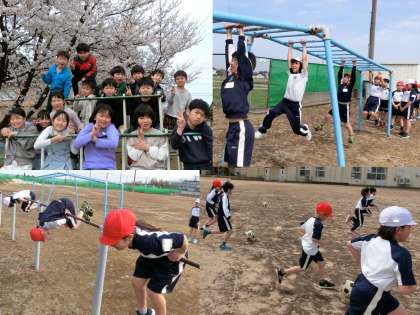 グラウンドでの体育の学習では、鉄棒やうんてい、サッカーボールを使って運動し、全員でリレーをして気持ちのよい汗を流しました。