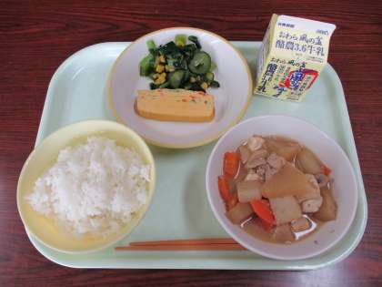 (献立) ごはん 牛乳 千草焼き コーン和え 鶏肉と大根のごますき焼き