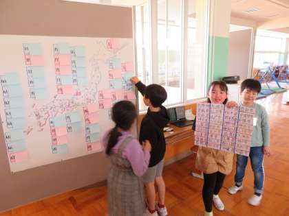 4年生は、社会の教科書や地図帳を広げ、47都道府県の特産物や観光地を調べて都道府県博士を目指しています。