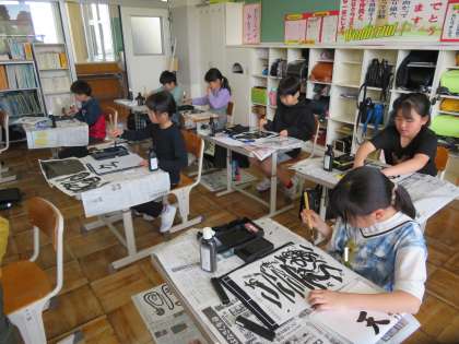 書写の時間には3・4年生合同で、姿勢や筆の持ち方、準備や片付けの仕方を確認し、3年生は筆運びの練習をし、4年生は「とめ・はね・はらい」の練習に取り組みました。
