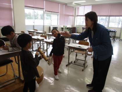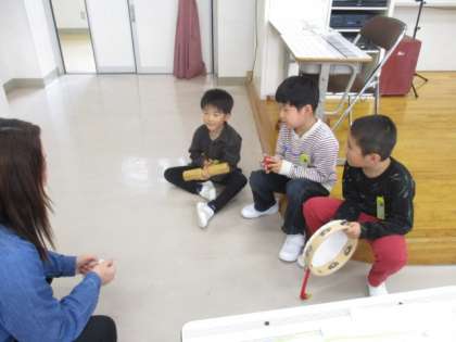 1年生は,音楽の時間にリズムあそびをしました。それぞれ好きな楽器を手にもち、「パンダ」「ティラノサウルス」等の言葉に合わせて、リズム打ちをしていました。