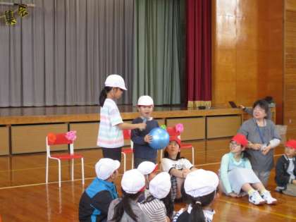 集会の中で、ボールを回すゲームを行いました。大きな輪になり、隣から隣へボールを回し、楽しい笑い声が響きました。