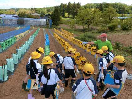 校区内で農業を営む地域の方にご協力いただき、農家の仕事や地域の魅力発見の学習に取り組み始めた3・4年生。
