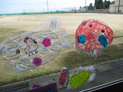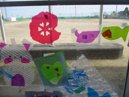 図画工作科の作品を、踊り場やランチルームの窓ガラスに掲示しました。光が当たって、さらにすてきな作品になりました。