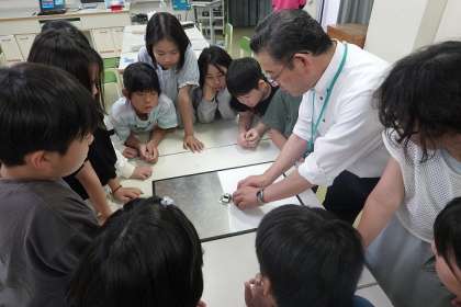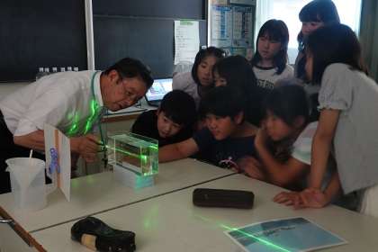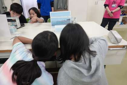 6月4日(火)サイエンスカー訪問活動 高学年「しんきろうの世界」 公開日 2024/06/04 更新日 2024/06/04 5・6年生 高学年は、蜃気楼について学習しました。光の屈折を利用して、向こう側の景色がゆがむ様子を体験しました。温度などによって見え方が変わることに驚きながら、蜃気楼のおもしろさを感じていました。