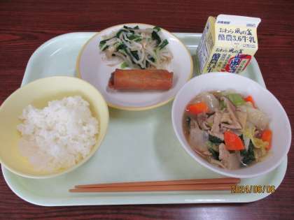 (今日の献立) ごはん 牛乳 春巻き 塩ナムル 八宝菜