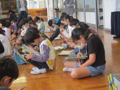 今日の船っ子ハーモニーの時間は、全校で区域連合音楽会に歌う曲を聞きました。1曲ずつ感想を書き、どのように歌っていきたいかを考えました。