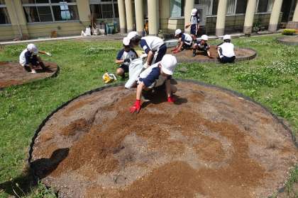 3〜6年生で花壇作業を行いました。全校で花の苗を植えるために、土を整えました。その後、3〜6年生でどんな花壇にしたいか話合いました。水曜日には、全校で話合います。今年はどんな花壇になるか楽しみです。