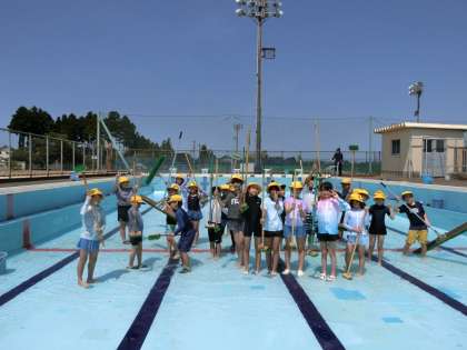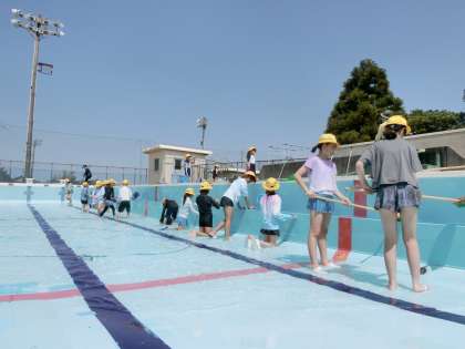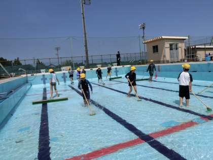 6月11日(火)プール清掃(3〜6年生) 公開日 2024/06/11 更新日 2024/06/11 今日の船峅っ子 今日の2限に、全校プール掃除をしました。3年生から6年生は、プールの床をデッキブラシで磨いたり、壁をスポンジでこすったりしました。1時間で見違えるようにきれいになりました。