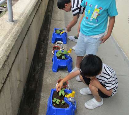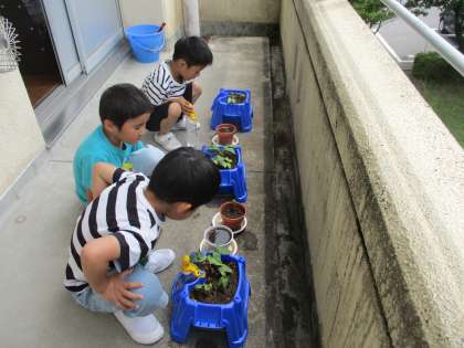 毎朝、あさがおの観察をしています。「葉が大きくなった」「新しい葉が出てきた」と、生長を喜びながらお世話をしています。