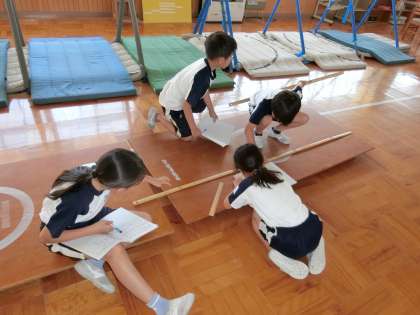 3年生は、算数の時間に1mの竹ものさしを持って身の回りの物の長さ調べをしました。