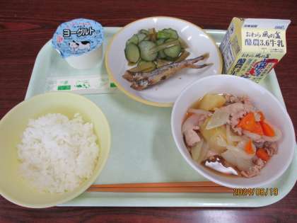 (今日の献立) ごはん 牛乳 ししゃもの米粉揚げ 茎わかめの中華和え 塩肉じゃが ヨーグルト