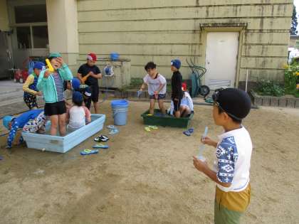 シャボン玉を作ったり、シャワーや水鉄砲の水をかけ合ったりして、夏の日差しや気持ちよい風を感じながら、楽しく過ごしました。