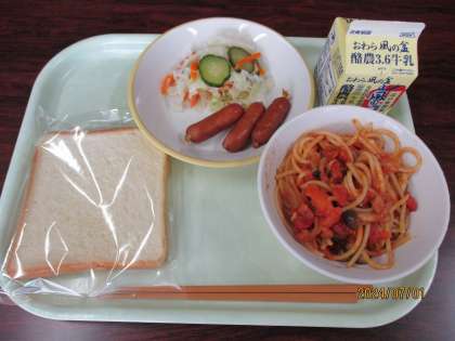 (今日の献立) 食パン 牛乳 粗挽きウインナー コールスローサラダ ツナとトマトのスパゲッティ