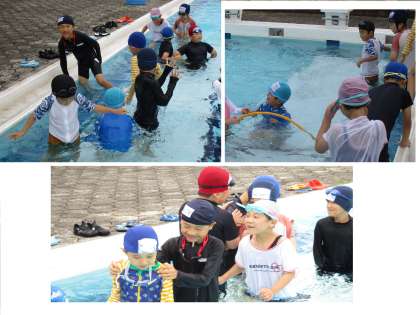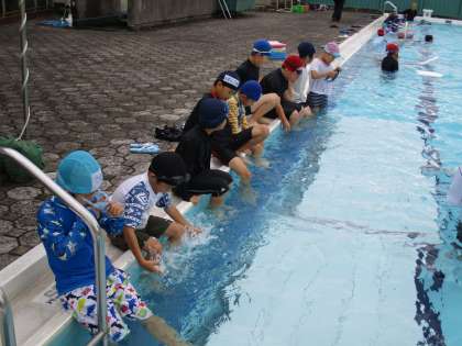 午前中の雨もやみ、気温も水温も条件をクリアしたので、プールで水遊びをしました。水が苦手だった子から、「もぐれるようになったよ」と、嬉しい報告がありました。