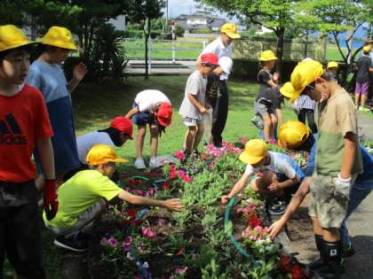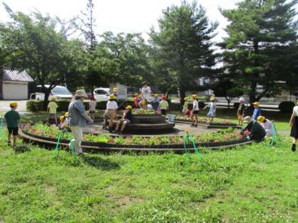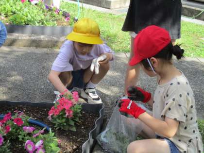 花壇の草取りや花摘みを行いました。美しい花壇を目指してがんばっています。