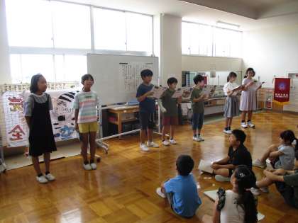 そして、今日は5年生の発表がありました。「Bilieve」を2部合唱で紹介し、「さすが5年生だね」「きれいな歌声だね」と、班のみんなから感想をもらっていました。