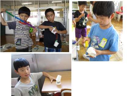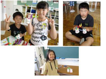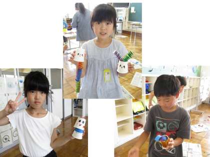 今日の図工では、各自が紙で作ったバネと、紙コップを利用して作品作りをしました。紙コップを顔に見立てて、顔が飛び出したり、揺れたりするなど、かわいい作品ができあがりました。