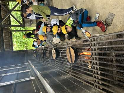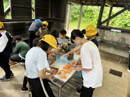 米とぎ、野菜切り、火おこし等役割を分担し手際よく行っています。