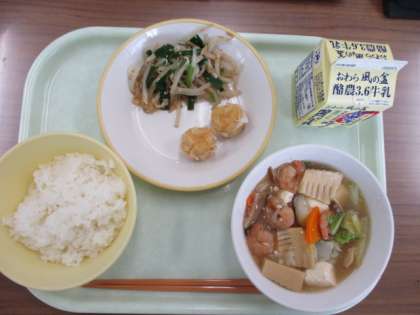 <今日の献立> ごはん 牛乳 にんじんシューマイ ナムル えびと豆腐のうま煮