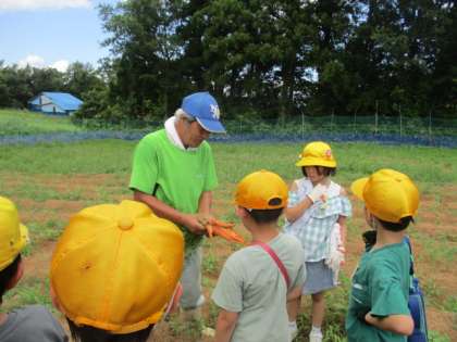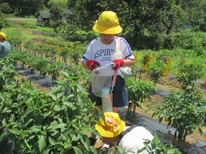 3・4年生は、地域にある農園の見学に出かけました。5月に行ったときと比べると、野菜苗はとても大きくなっていました。ニンジン、ピーマン、シシトウ、ナスの収穫体験もさせていただき、子どもたちはとても喜んでいました。