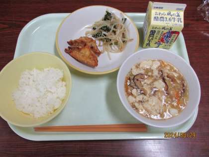 (今日の献立) ごはん 牛乳 揚げ餃子 塩ナムル マーボー豆腐