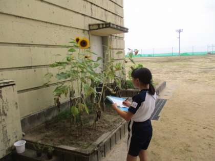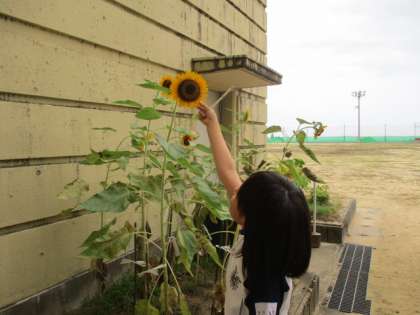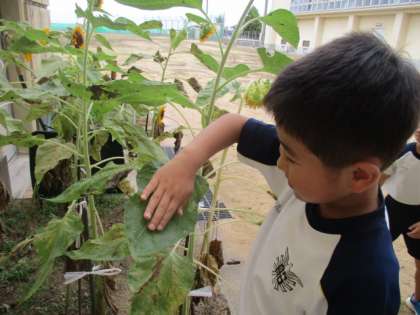 夏休み中にきれいに咲いたヒマワリの観察を行いました。高さを測ったり、葉の大きさを手と比べたり、花の様子を観察したりしました。