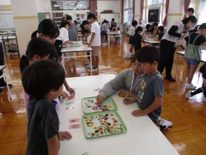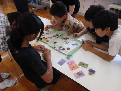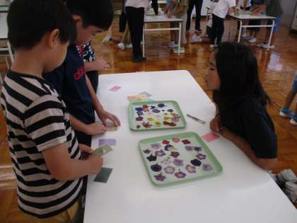 台紙の色や花の組み合わせを考えて、ラミネートフィルムにはさみました。
