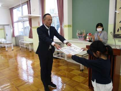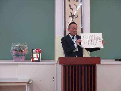 表彰式では、まず、富山市花いっぱいコンクール学校部門モデル花壇金賞の紹介がありました。富山市科学展覧会入選受賞の紹介もありました。