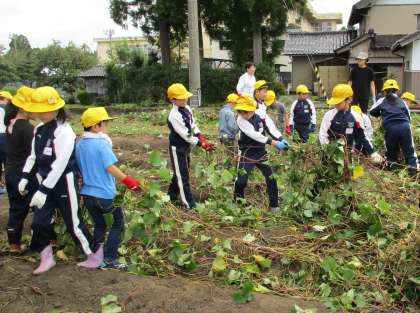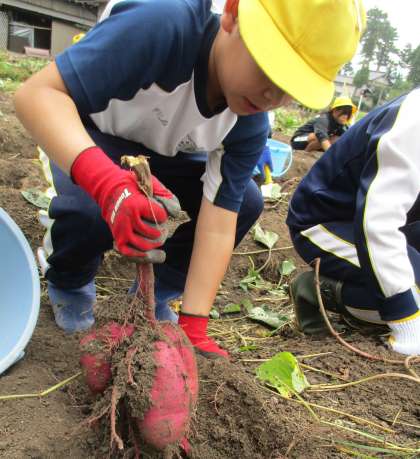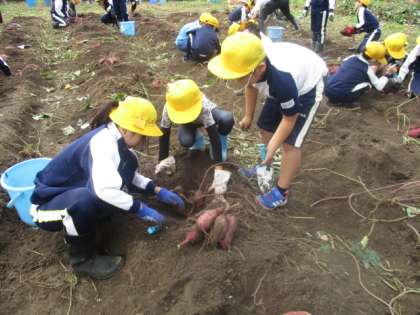 午前中、なんとか天気に恵まれ、全校でさつまいも掘りをすることができました。