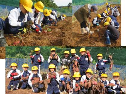 校区内の農園では、1学期に自分たちが植えたさつまいもの収穫を体験させていただきました。大きないもを抱えた子どもたちの顔には満足感と達成感があふれていました。