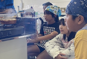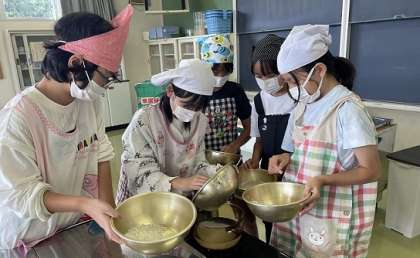 5年生は家庭科の学習で、ご飯を炊きました。一人一人お米をといで、給水する前と後ではどう変わるか確認しながら進みました。普段は見られない鍋の中での様子を見ながら、だんだん膨らんでご飯になっていくことに驚いていました。炊きあがったご飯は、とてもおいしくできたようで、もりもり食べていました。