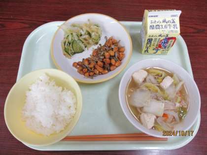 (今日の献立) ごはん 牛乳 小魚入りフライビーンズ 合わせ和え 白菜鍋