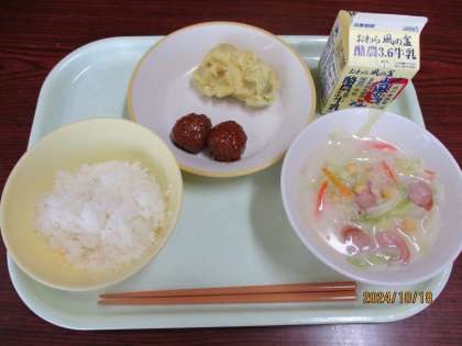 (今日の献立) ごはん 牛乳 ミートボール チーズおさつ 豆乳野菜スープ