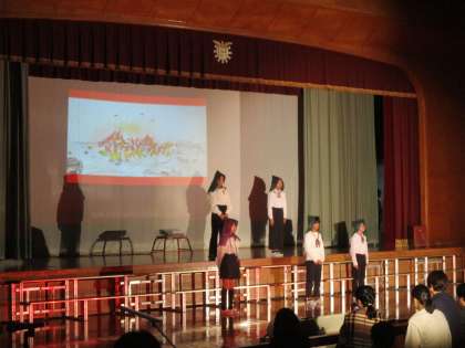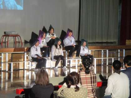 今年は、富山大空襲をテーマに調べたことや聞いたことを発表しました。場面の立ち位置や表現の仕方は、自分で考えて演じました。