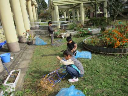 支柱にからみついていたアサガオのつるを、悪戦苦闘しながらも、ていねいに取り外しました。このつるを使ってリースを作るのを楽しみにしています。