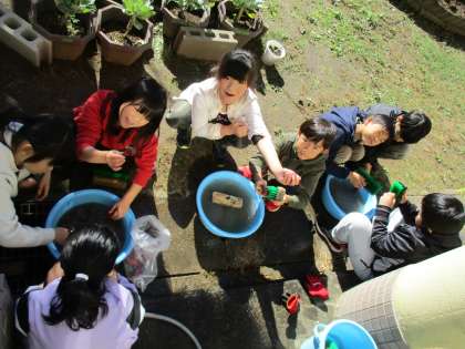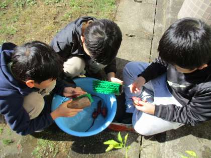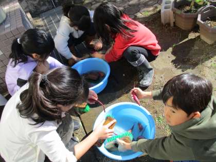 今日は、2年生の「さつまいもパーティー」の日です。さつまいもを洗うことから始めました。