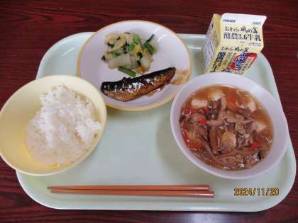 (今日の献立) ごはん 牛乳 いわしのしょうが味 白菜ひたし 豆腐ときのこのあんかけ煮