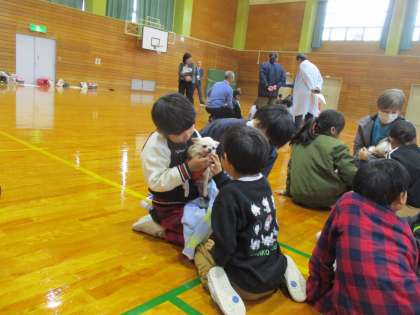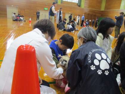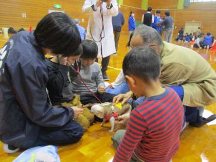 飼い主さんや獣医さんに見守られながら、犬と触れ合ったり、心音を聞いたりしました。