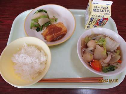 (今日の献立) ごはん 牛乳 揚げ出し豆腐のごまだれかけ カブのいろどり 冬野菜なべ