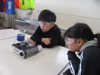 温度によって色が変わるインクを使っての実験だったので、水のあたたまり方がよく分かります。