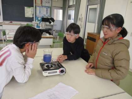 温度によって色が変わるインクを使っての実験だったので、水のあたたまり方がよく分かります。