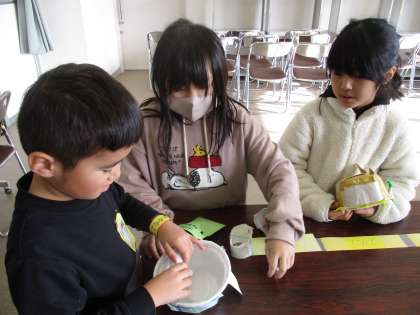 「手前に回すと前に進むよ」「太いゴムより、細いゴムの方が、長く回るんだよ」など、自分たちが気付いたことを伝えながら、おもちゃを紹介していました。