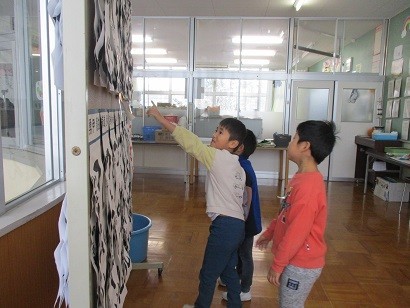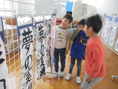 「薄い紙に、きれいに書いてあって、すごい。」と、毛筆の作品に興味津々です。
