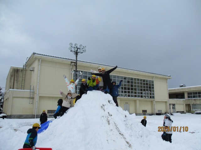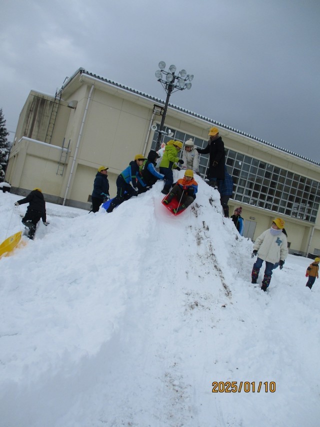 地域の方が、学校のグラウンドに大きな雪山を作ってくださいました。