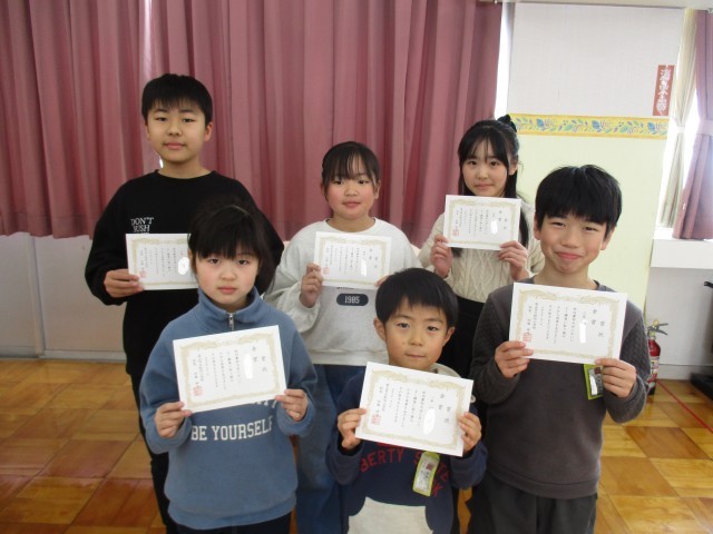 校内書き初め大会で、金賞を受賞した人を紹介しました。