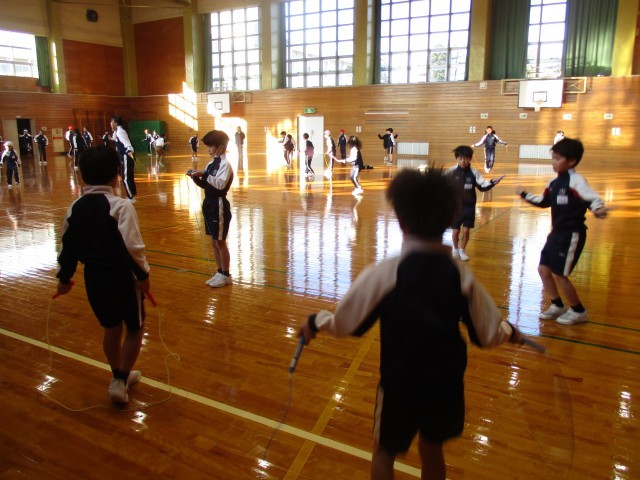 今日の朝の運動では、短縄跳びに取り組みました。