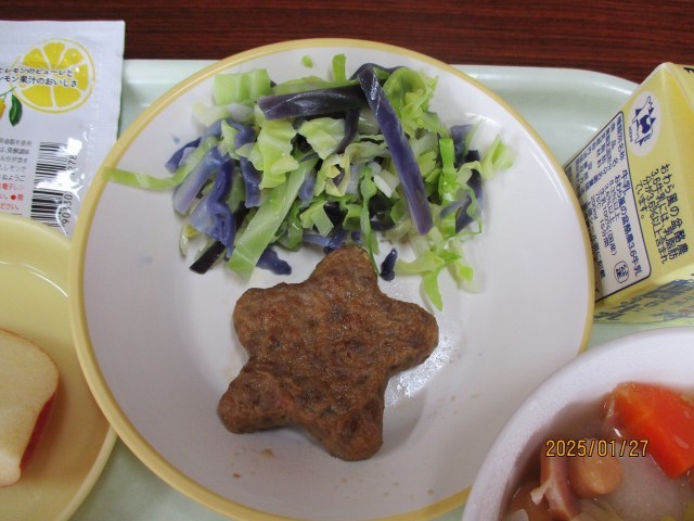 ドレッシングをかけると色が変化するサラダや根や茎、葉を食べる野菜を使ったポトフが登場しました。