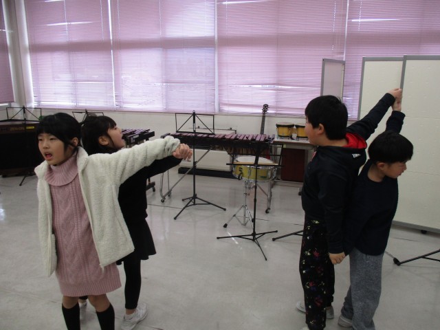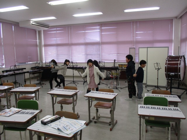 2年生の音楽では、「わらべ歌」を楽しんでいました。「なべなべそこぬけ」を歌っているところです。