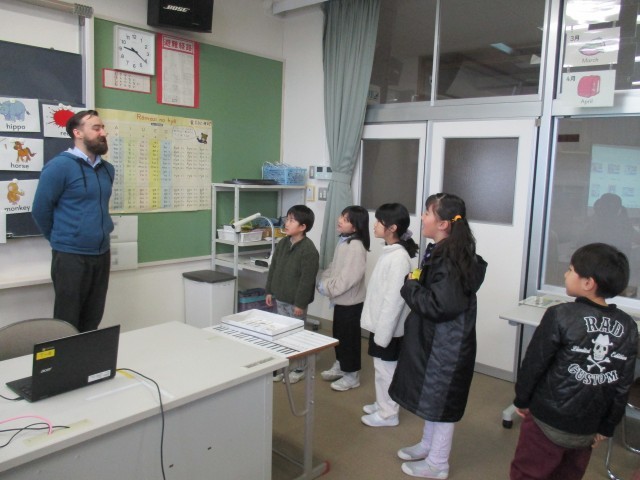 英語で、色や動物の名前を言ったり、ALTの先生の指示に従って、自分の頭や鼻、ひざをタッチしたりしました。